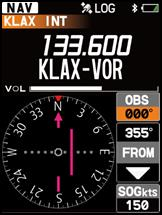 When the FTA-850L receives a VOR signal, the display automatically switches to the NAV band screen and shows the CDI. The top of the compass rose always indicates the direction set as the OBS. The SOG (Speed Over Ground) is displayed only when the FTA-850L internal GPS unit is activated and a fix is acquired.